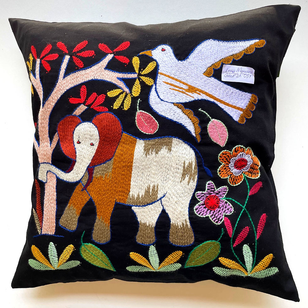 Our medium sized cushions are of 40 x 40 cm (15.75 x 15.75 in) dimentions. Cushions are hand embroidered in bright colours on a black background of cotton fabric. The back of the cover has two overlapping panels to allow the opening for the stuffing or pillow inner (not included).