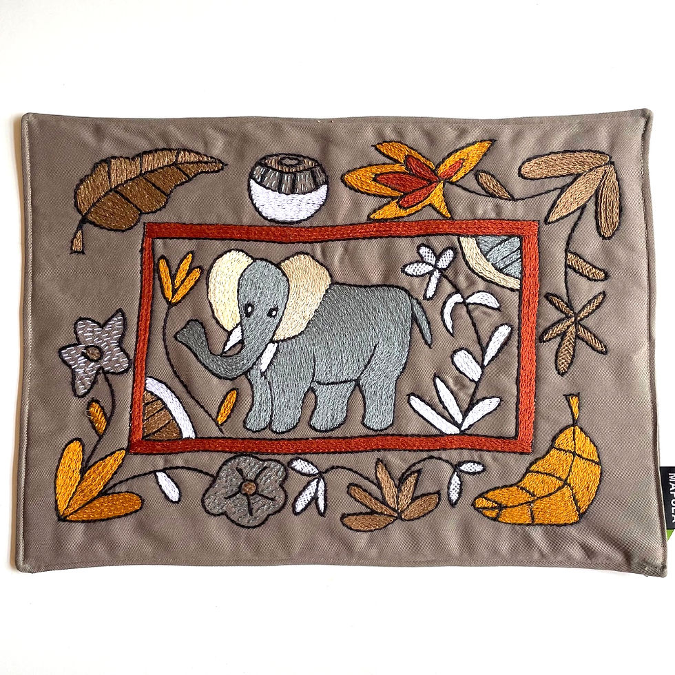 The 40 x 32 cm (15.7 x 12.6 inch) padded placemats are embroidered on black cotton fabric on one side only. The designs are a mix of people, cultural scenes, animals and flowers.